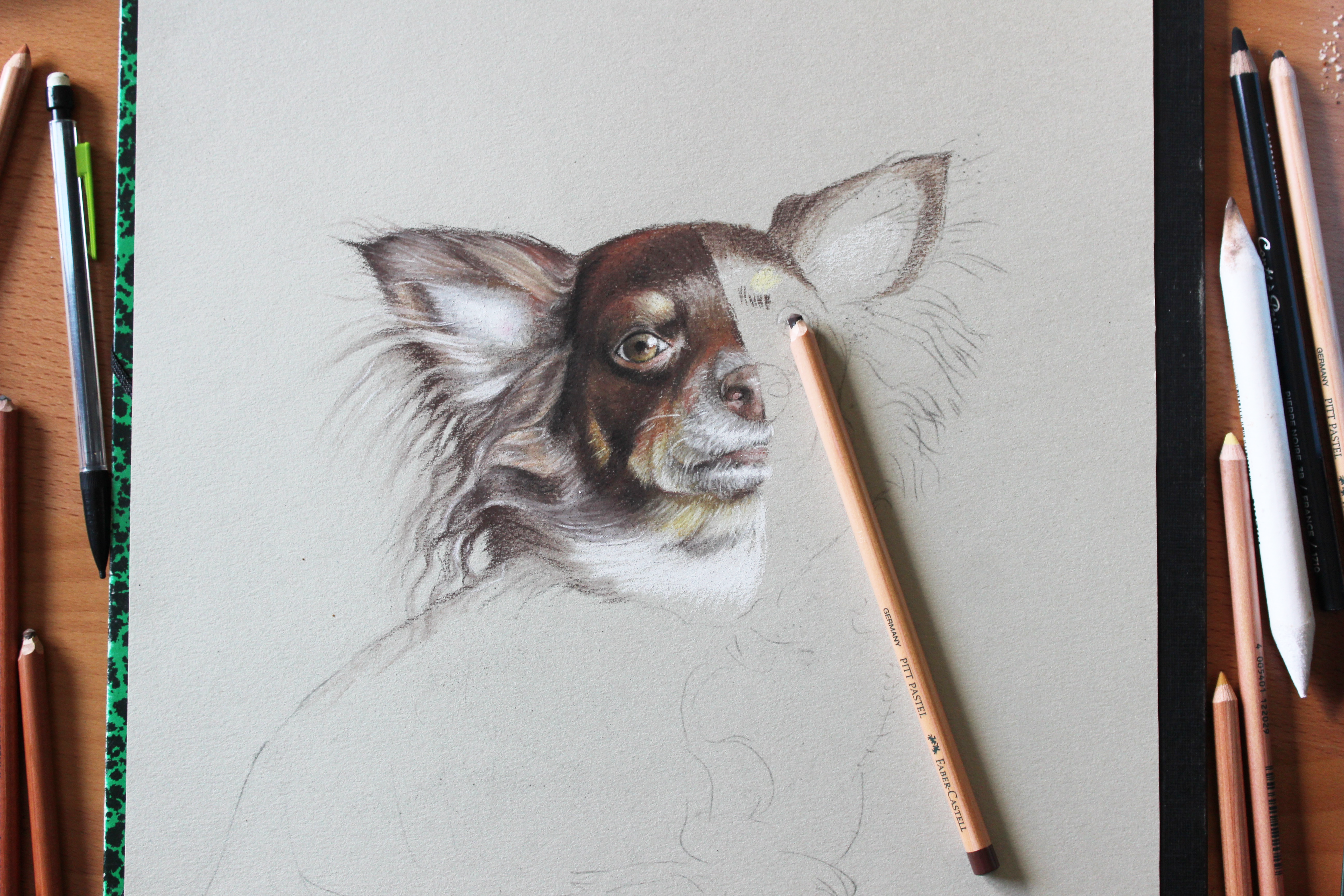 Je passe de 3 à 6 heures sur chaque portrait, parfois plus. Je prends le temps nécessaire pour réaliser un portrait ressemblant et vivant. Mon style est réaliste, voire hyperréaliste quand les photos le permettent.